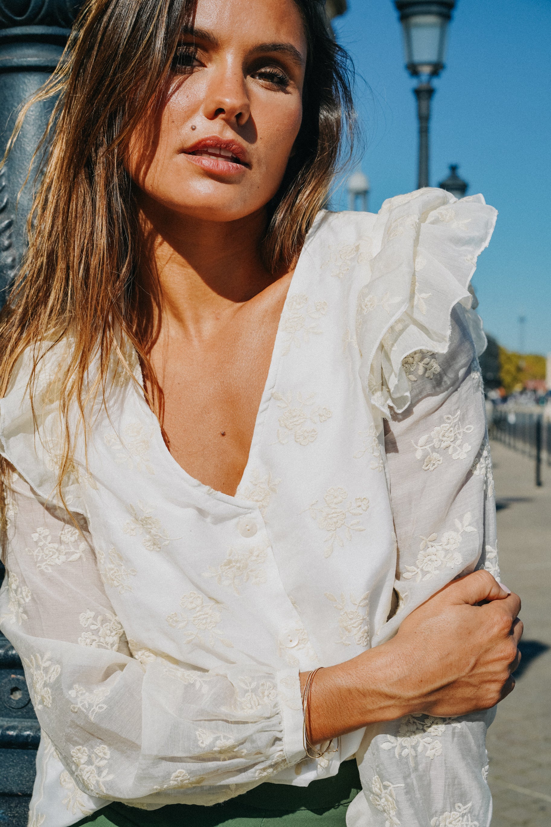 Les volants aériens sur les épaules structurent la silhouette avec féminité, tandis que les petits boutons en nacre à quatre trous apportent une touche d’élégance discrète, fidèle à l’esprit Audélie.