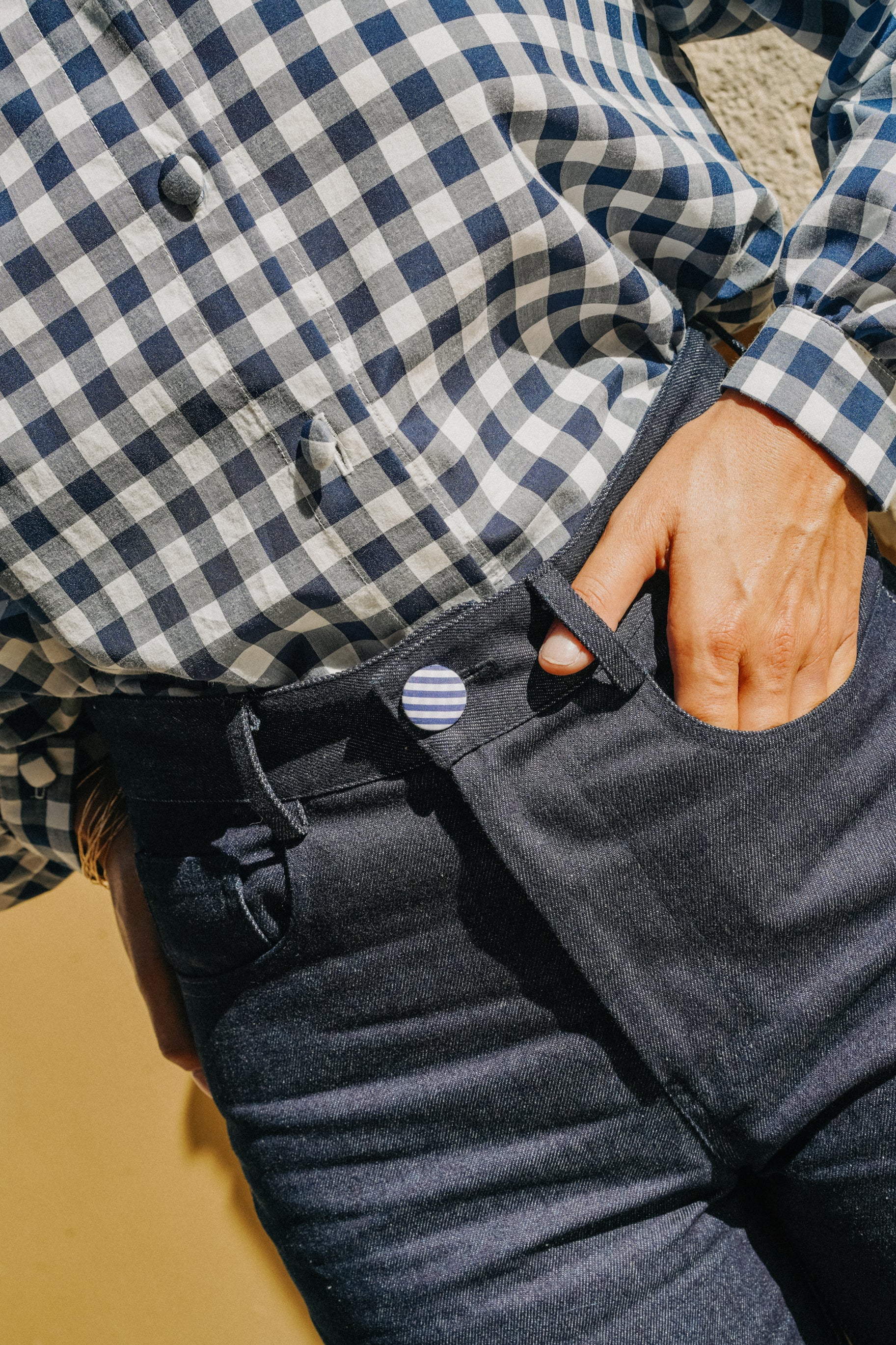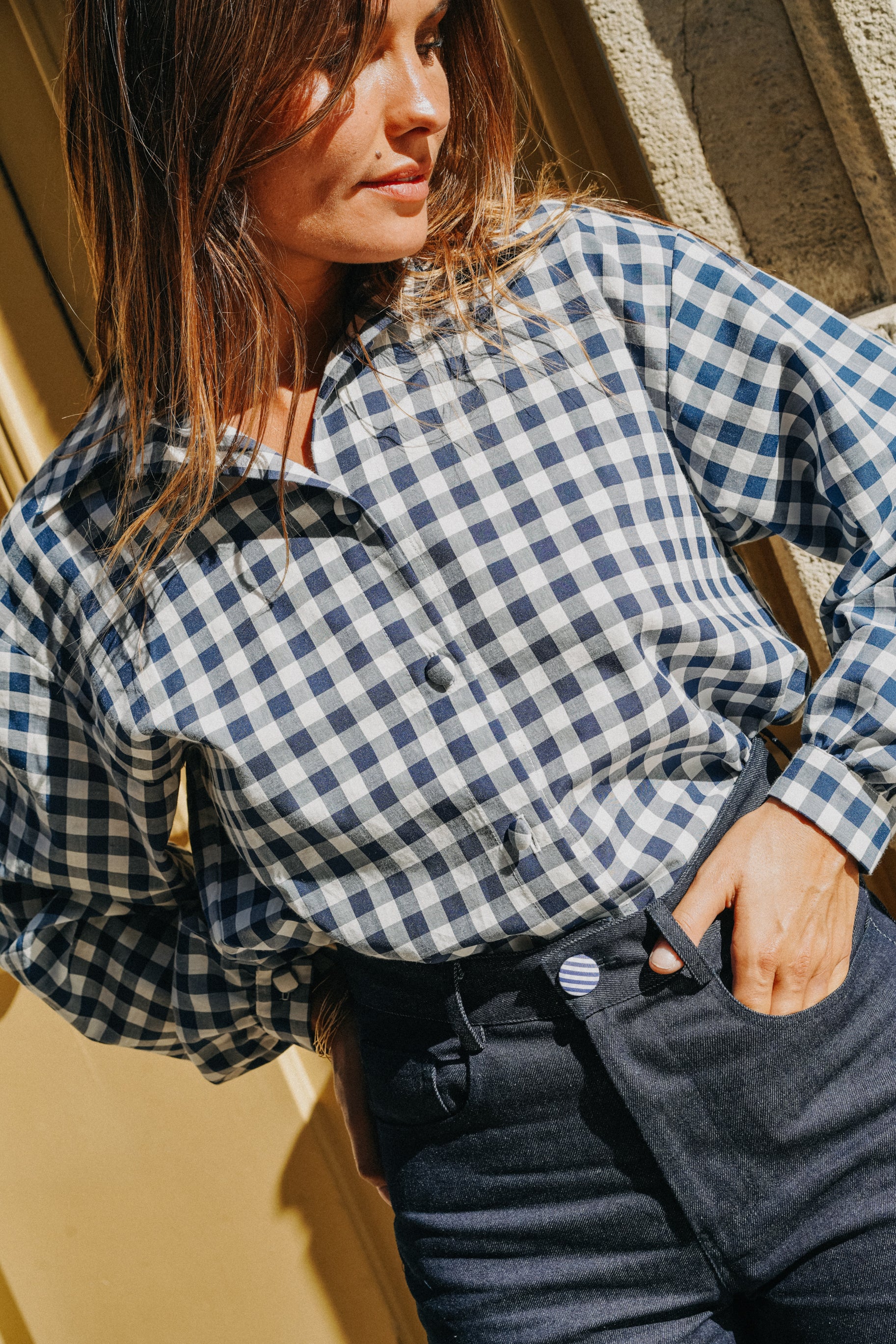 La chemise Boy incarne le parfait équilibre entre allure masculine et charme féminin. Confectionnée en 100 % coton, elle séduit par son tissu vichy bleu marine, à la fois classique et intemporel.